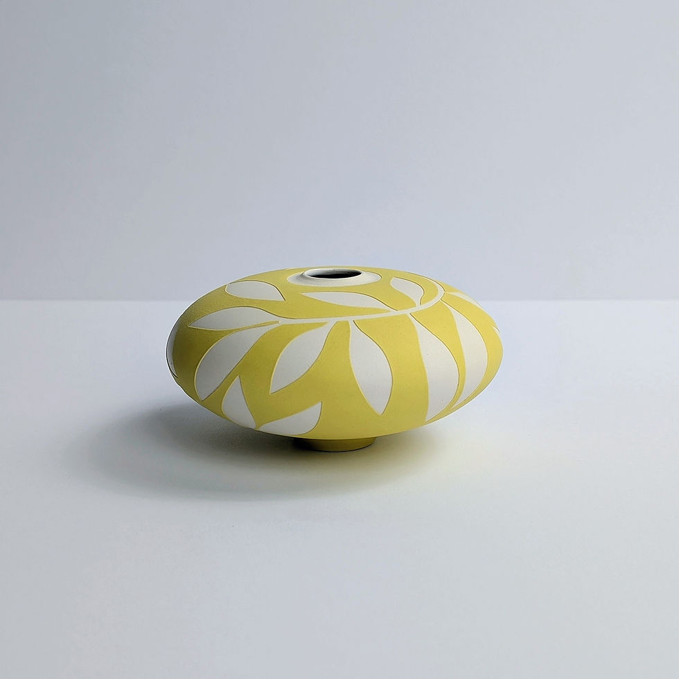 Georgie’s vessels and bowls are decorated with her distinctive style of paper resist, which she has been perfecting now for nearly 20 years. She cuts the paper by hand and builds up the designs as she goes, which means no two pieces are ever identical. Layers of colour are applied with brushes to create bold graphic motifs once the paper is peeled away. She enjoys the challenges that come from working with this technique - always trying to achieve the perfect balance between surface, form and decoration. Her aim is to produce pieces that are calm, carefully considered and timelessly elegant.